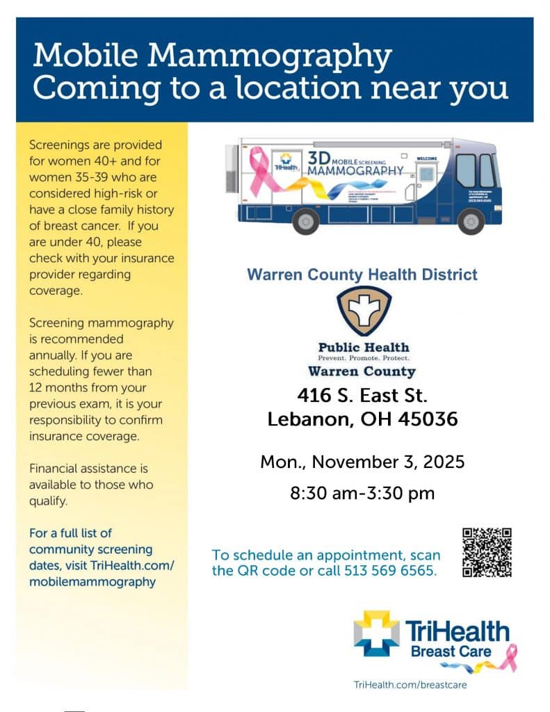 TriHealth Mobile Mammography will be at WCHD on Nov. 3. For more info call: 513-569-6565.